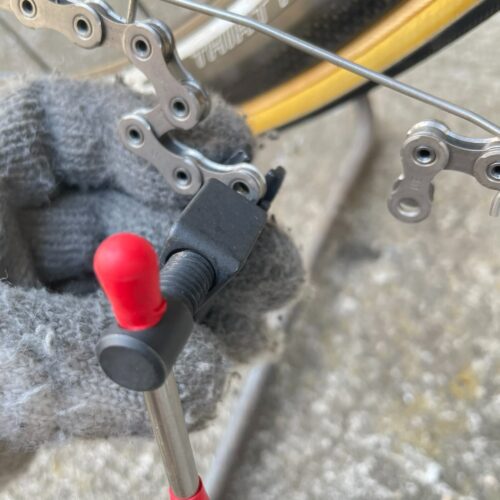 古いチェーンのコネクトピンをチェーンカッターで押し出しチェーンを切るのだが、その前に…
