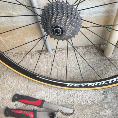 フレームから後輪を外し、工具でスプロケットを外す(外し方省略)