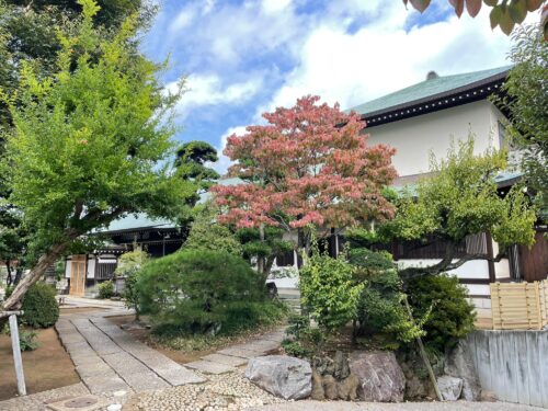 矢切駅を過ぎると、何やら立派な寺の屋根瓦が見えてくる。
