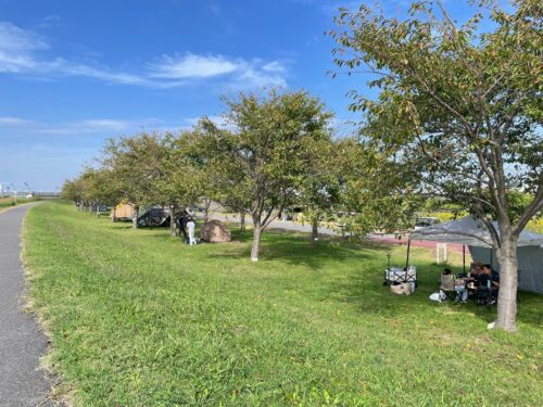 柳原水門を通り、土手脇にあるキャンプ場の脇を走ります。