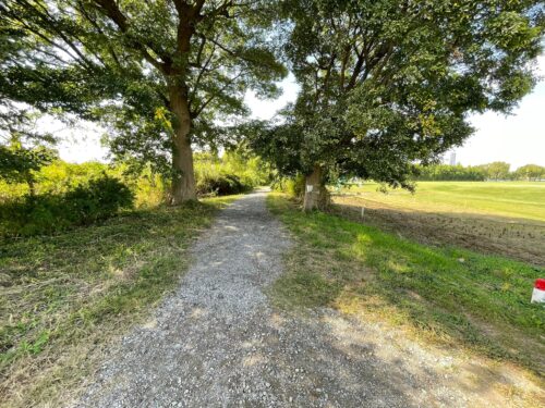 左岸の渡しは行ったことがないので、ゴルフ場の間を抜ける砂利道を自転車引いて行ってみることにします。