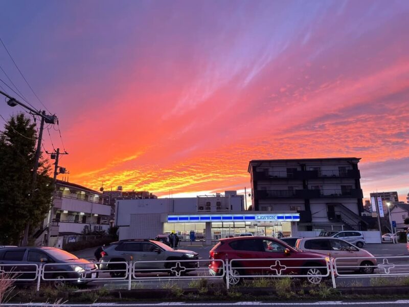 先週の金曜日の夕方、図書館からの帰り道。ローソンの背景が真っ赤な夕陽に包まれ、立ち止まってカシャ❗️。