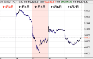 11月になり高値警戒から下がり出した日経平均。11月5日突然の下落5万円割れ、特にAI銘柄中心で下落。