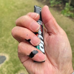 今回焦茶のフェンスですが、黒でも目立たないのでこれをつかって白い溶剤を黒く塗ります。