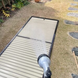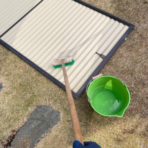 戸袋から1枚づつ取り出し、平置きにしてデッキブラシでゴシゴシ汚れを落とす。