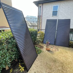 洗い終わった雨戸をフェンスに立てかけ、しばし乾かしている間に戸袋の中もついでにホウキで掃き出す。